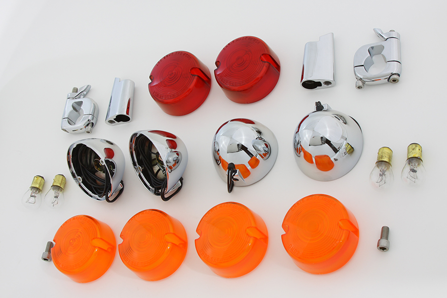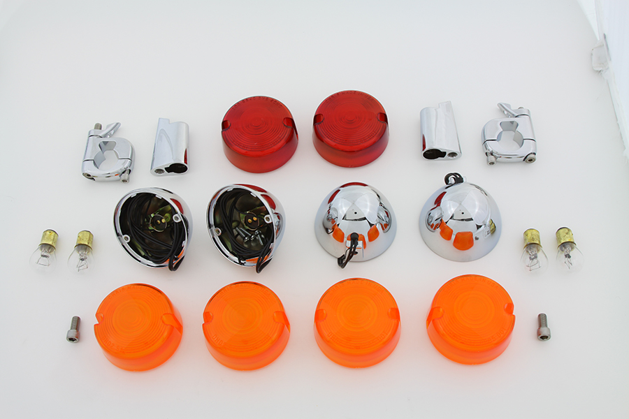 Fits FXR 1986-94 ,,XL 1986-UP?? ..Complete kit that comes with mounting brackets. .Take a good look before buying. Kit includes 4 amber assemblies, 2 red lens, 2 handlebar clamps with screws, 2 rear support with screws. Bulbs are clear, dual filament, 12 volt 23/8 watt.. Check your parts book for correct fitment. .Reproduction parts..