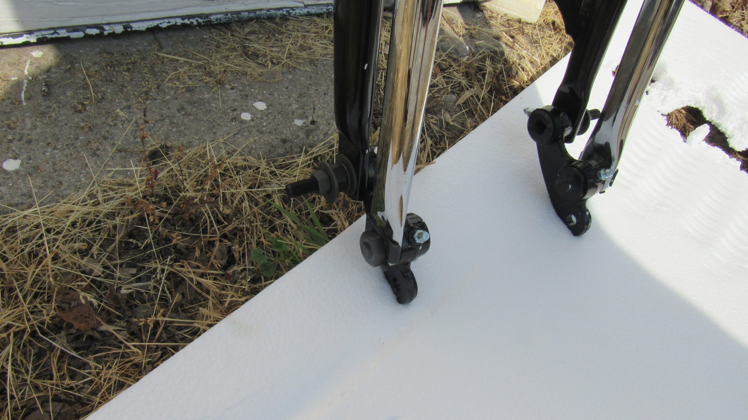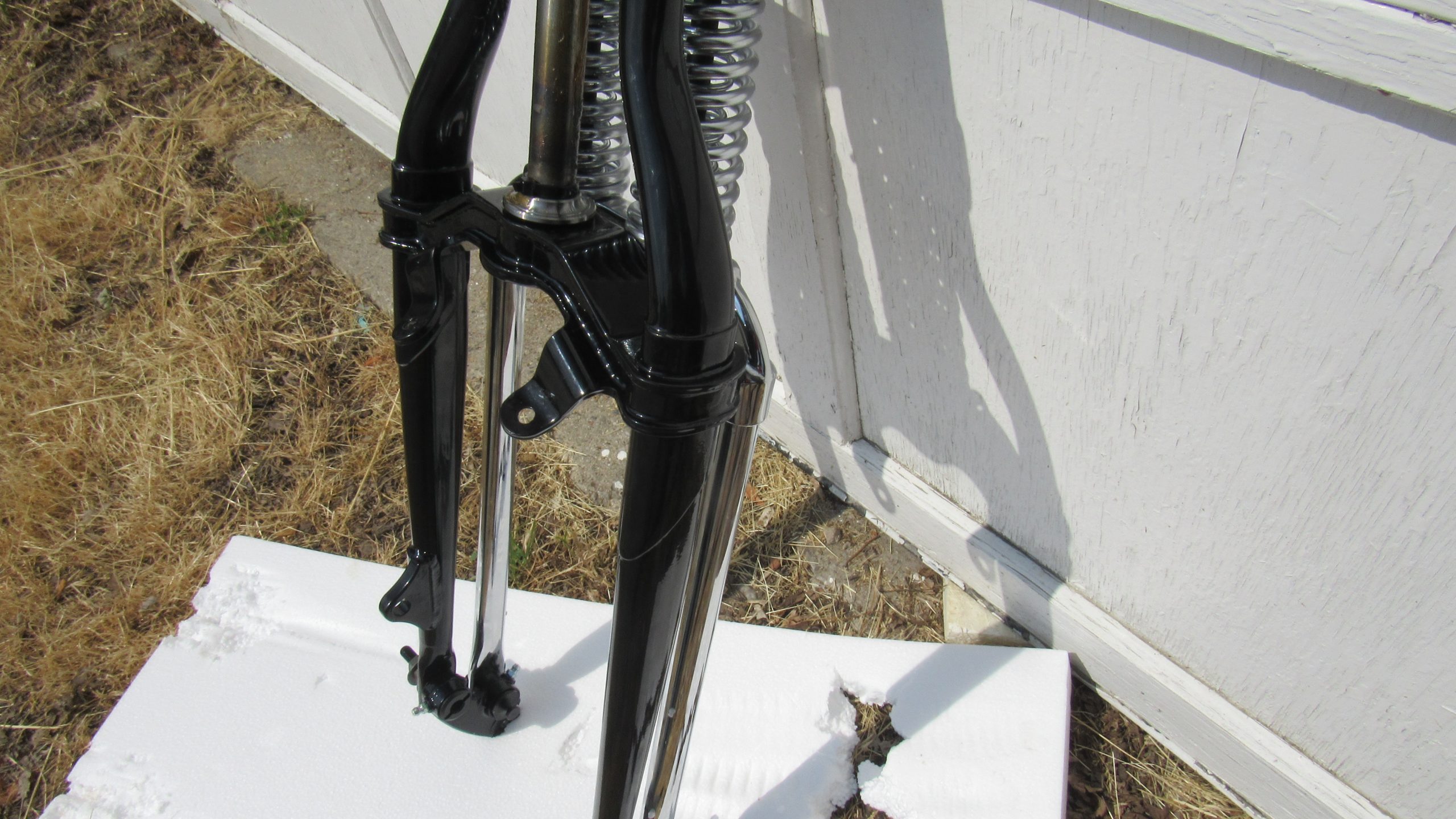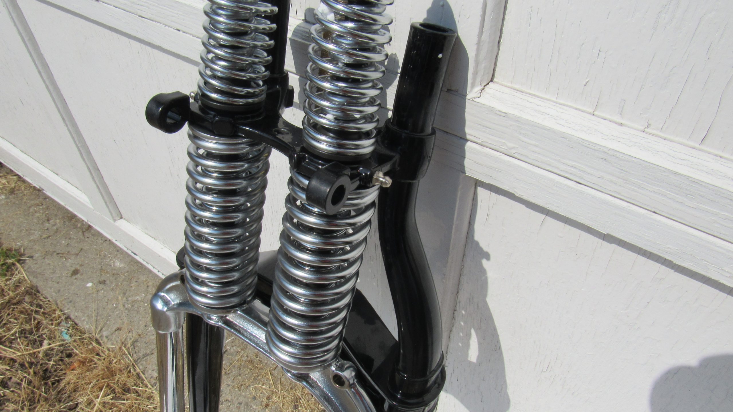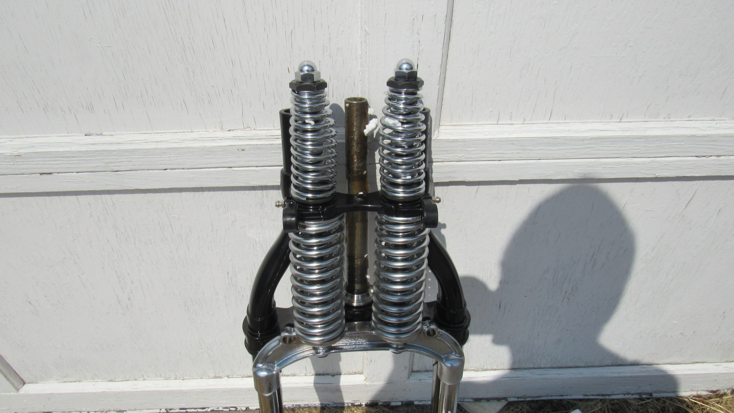 Fits 45 Frames 1937-52.. 7/8″ Neck.. Replica Unit features chrome front legs, chrome outer springs, black rockers, and black rear legs. Includes inner and outer springs, front and rear legs, inside style rockers for a 3/8″ axle, studs, bushings, and spring rods with bushings. Dose not come with stem hardware.. *NOTE* Inside Rockers**(WL,WLA). Reproduction parts