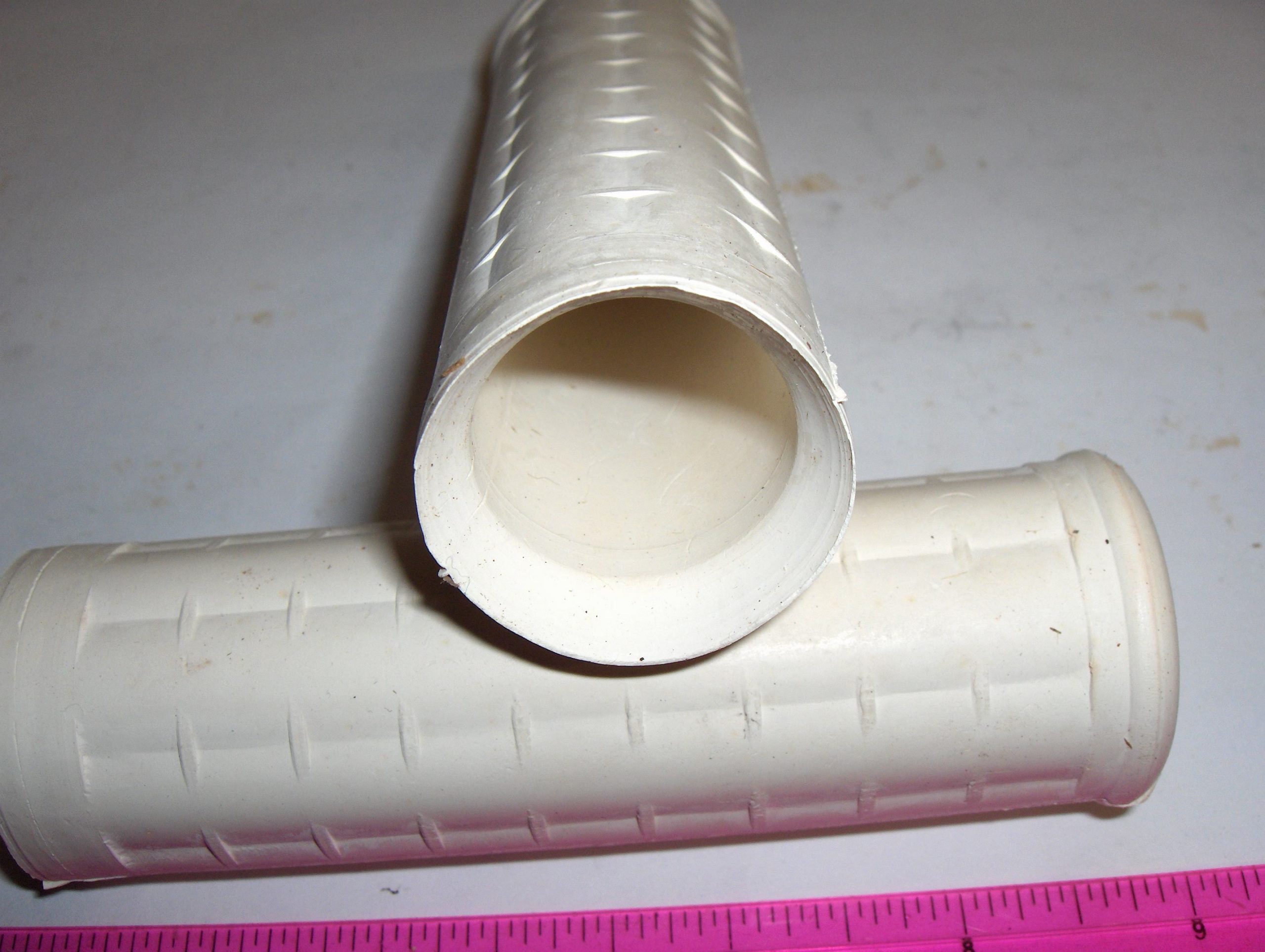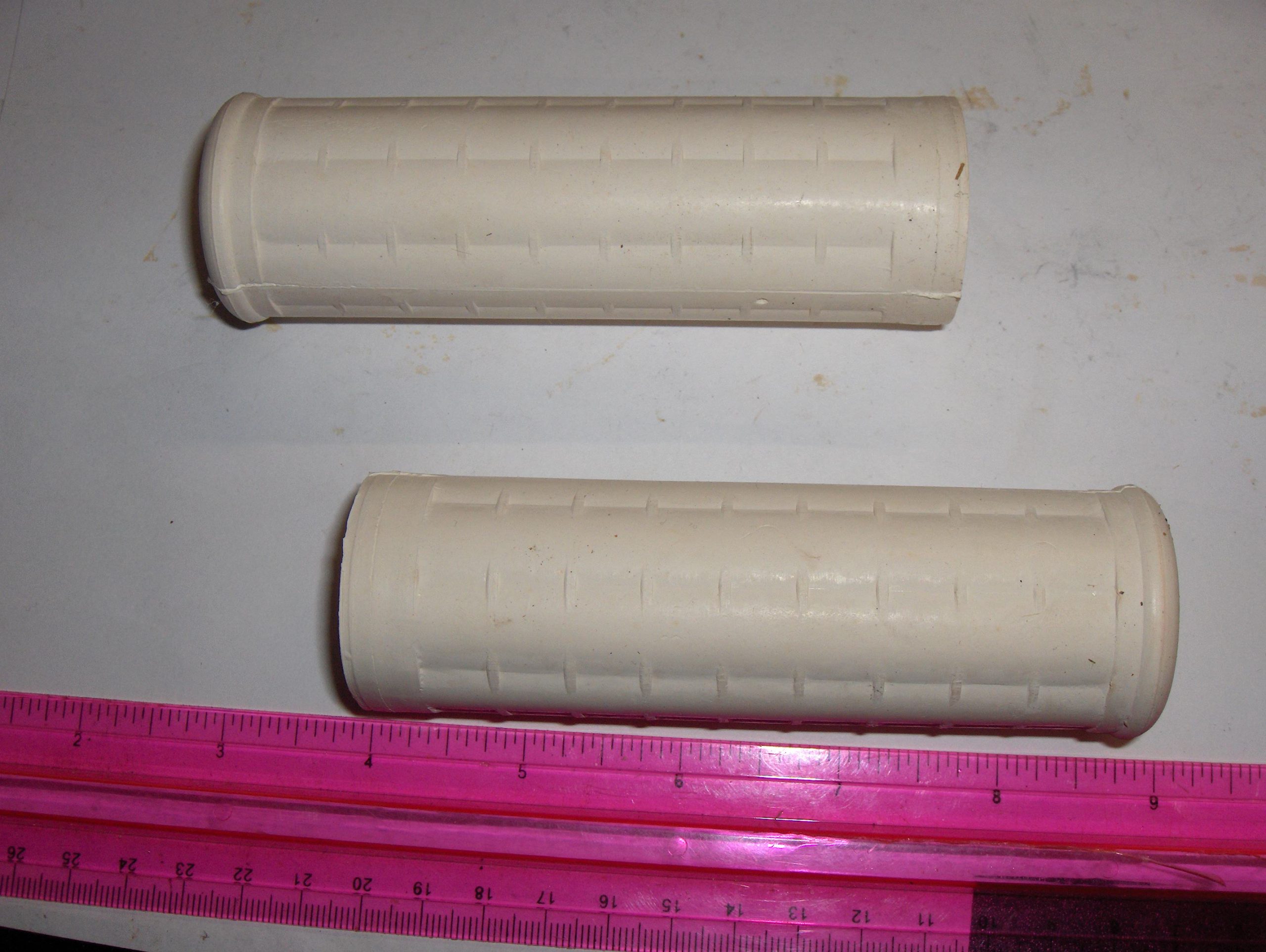Replica white waffle grips are soft rubber with 1-1/8″ inner diameter on both sides to fit internal throttle control. Ends of grips are solid. .Fits 1949-UP??