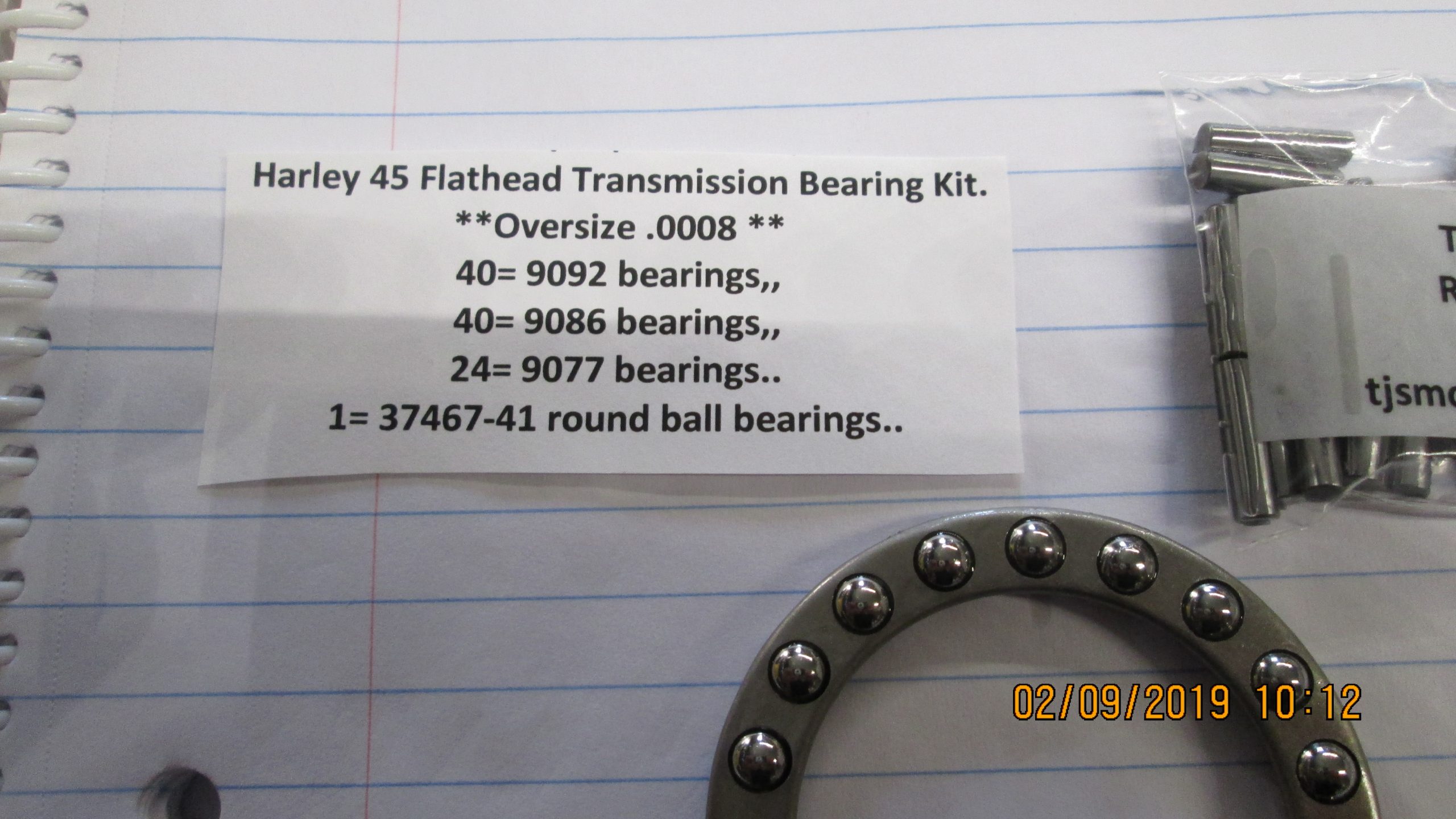 You get 40= 9092 bearings,,40= 9086 bearings,,24= 9077 bearings..1= 37467-41 round ball bearings.(STD). ..Fits 45’s trannys from 1941-73 ..Enough bearings to do a complete transmission..**Theses Bearings are all OVERSIZE .0008**..Theses are reproduction parts.