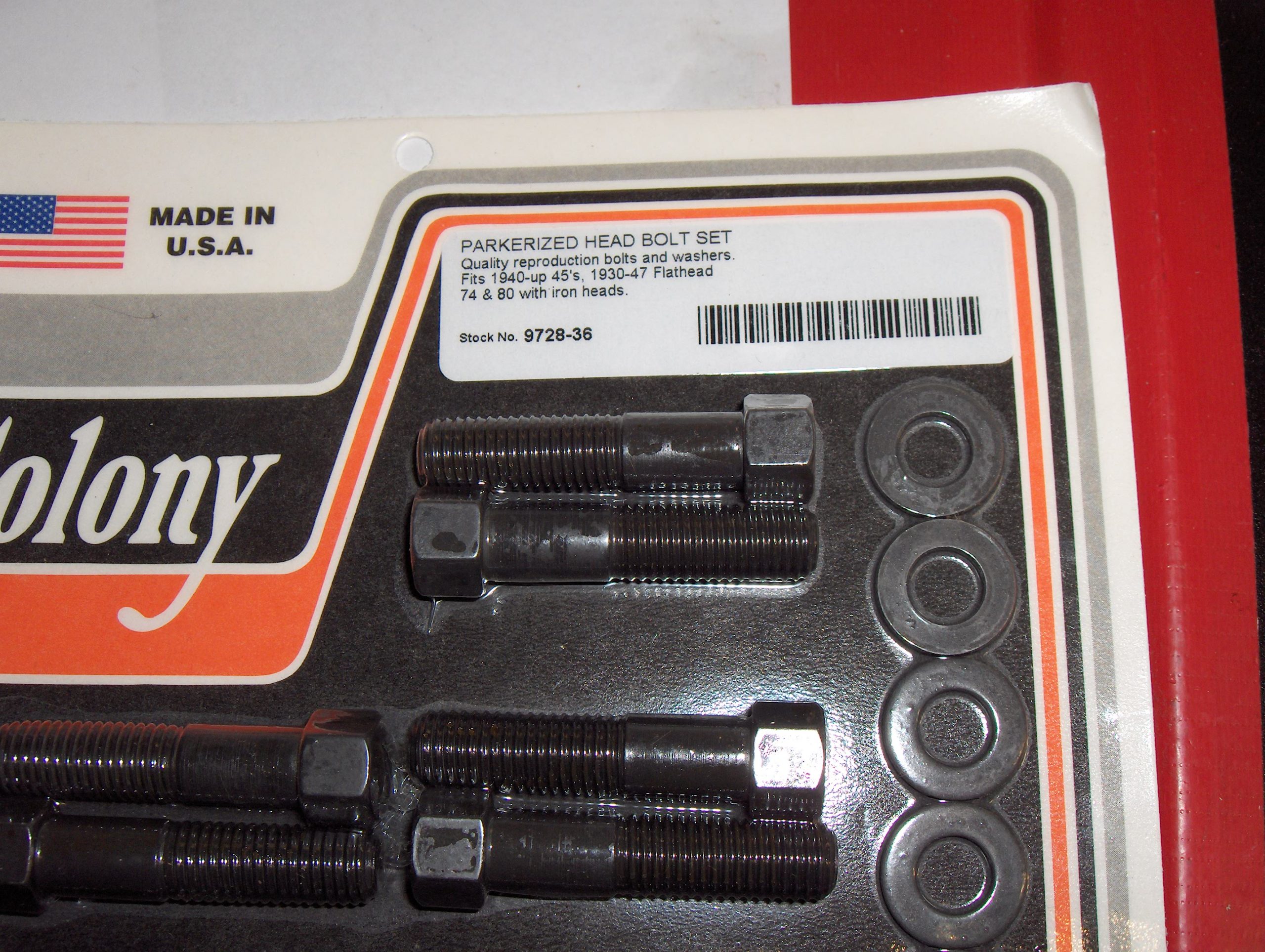 Parkerized stock headbolt kit for Ironhead engines with washers. Fits flathead 1940-73…Check your parts book for correct fitment. .Reproduction part..