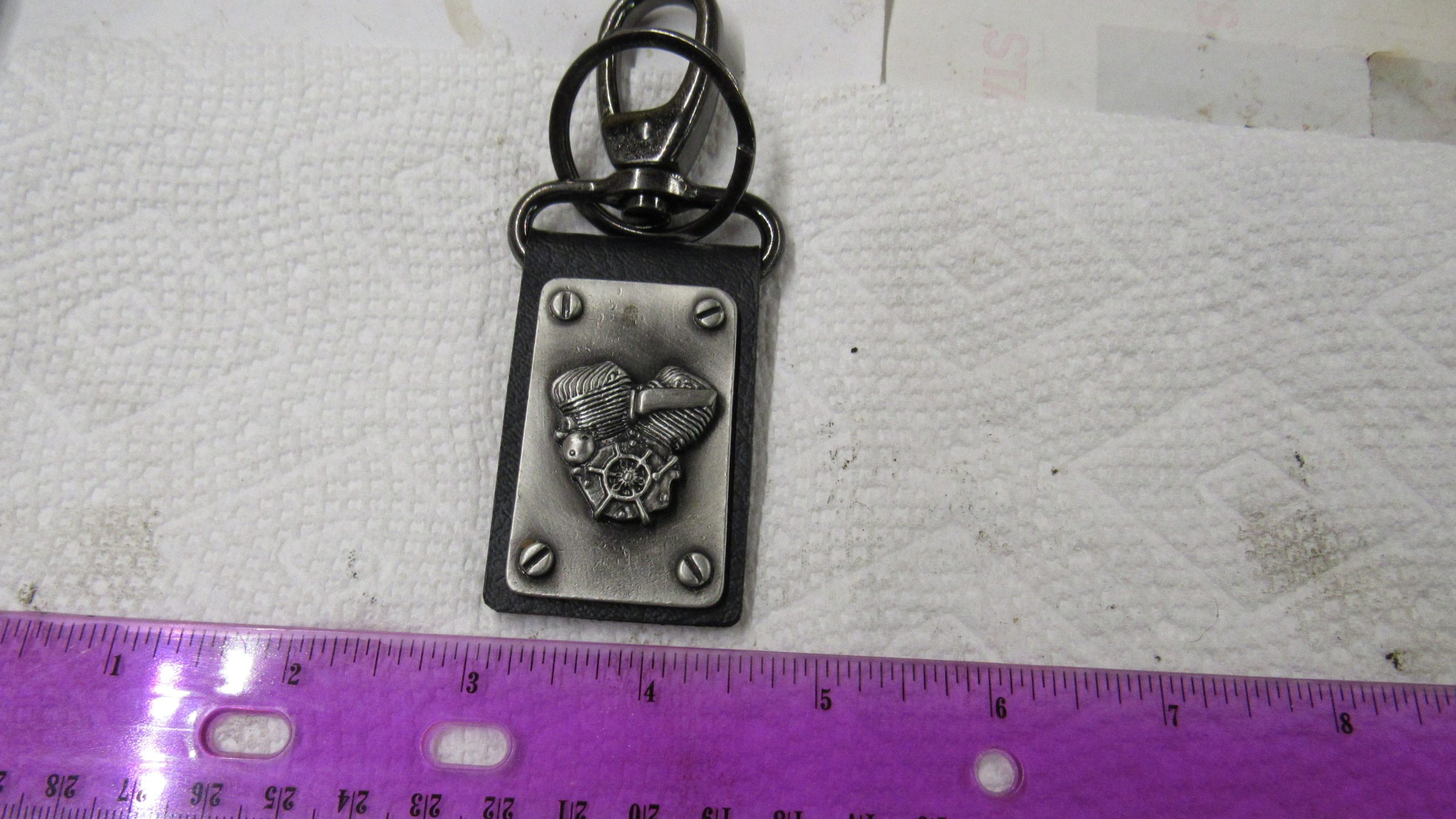 Flathead style motor keychain with a silver patina finish. The motor is riveted in each corner to the leather backing.