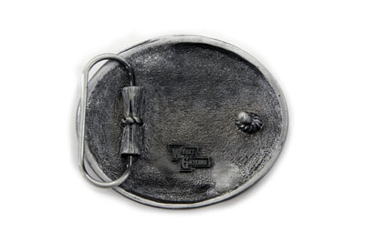 Oval style belt buckle features loud pipe design on buckle with a silver patina finish.
