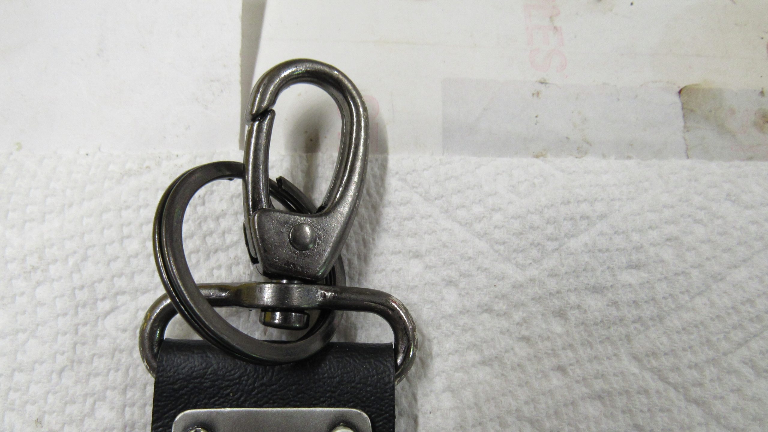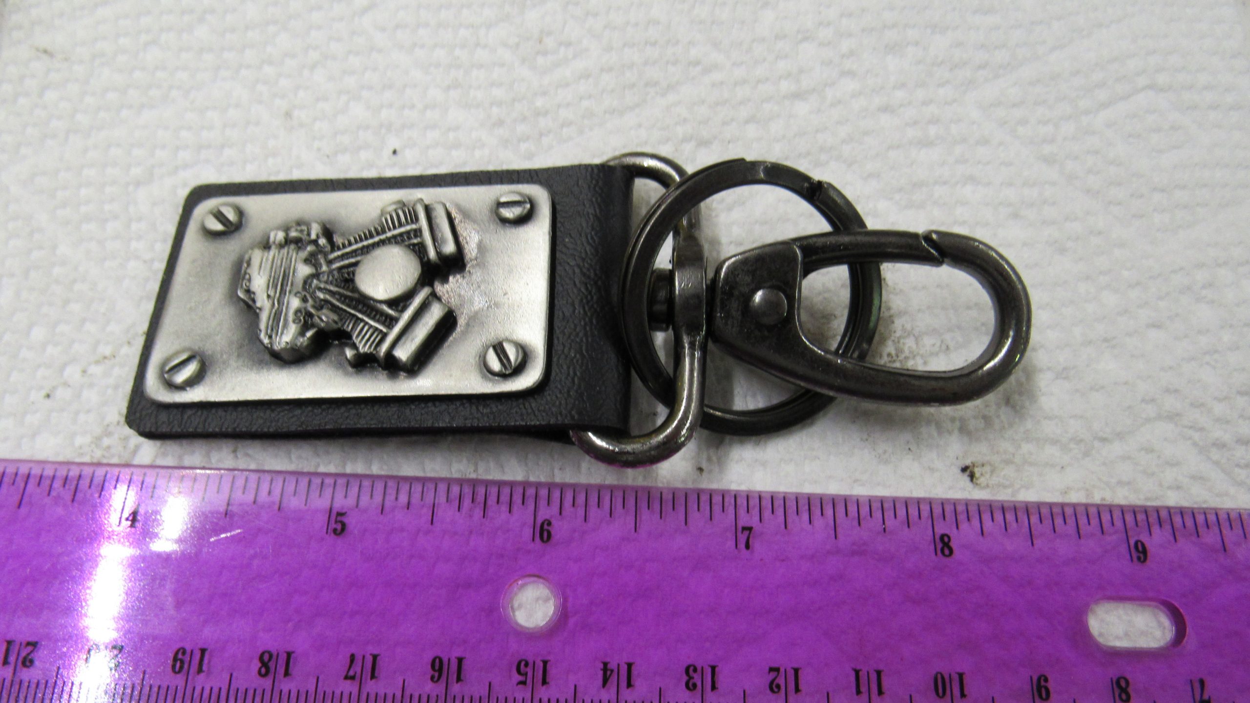 Panhead style motor keychain with a silver patina finish. The motor is riveted in each corner to the leather backing.